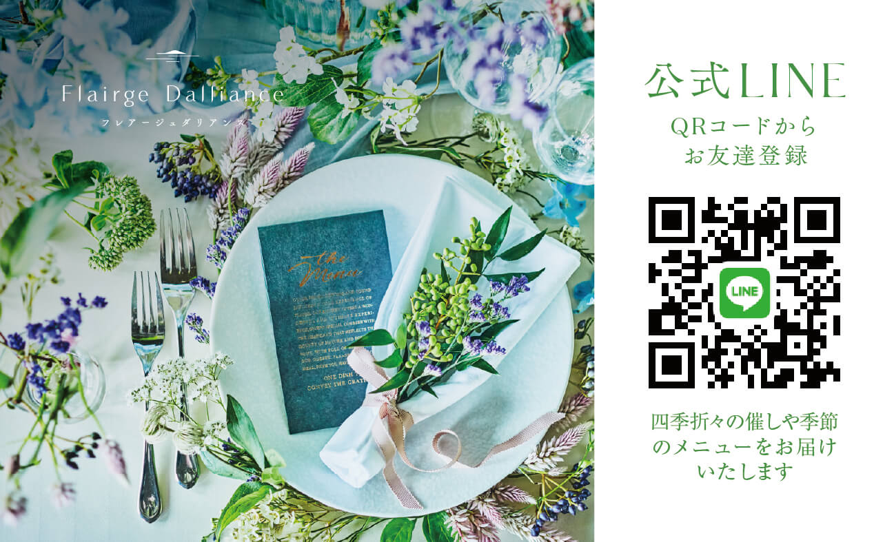 この度フレアージュダリアンスではLINE公式アカウントを開設いたしました 季節ごとに移ろうメニューのご紹介や、期間限定のイベント ささやかなご優待など、ここでしかお届けできない情報をお届けしてまいります この機会に是非ご登録ください