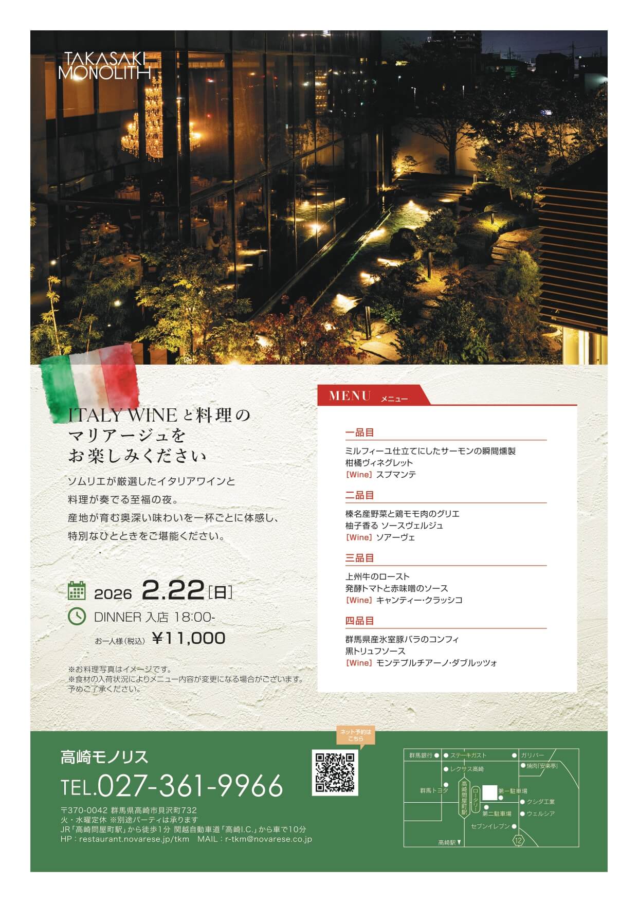 ソムリエ厳選ワインと上州の食材を使用したお料理で特別なひとときをご堪能下さい